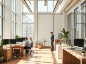 A man in a suit focuses on his laptop at a modern office desk, with plants and bookshelves in the background.